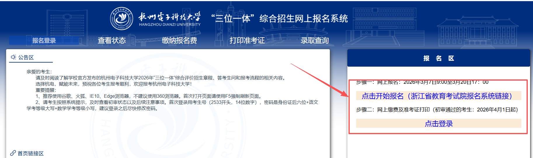 2026年的报名入口将保持稳定考生报名须通过杭州电子科技大学本科招生网(http://zhaosheng.hdu.edu.cn) 首页的“三位一体”报名系统入口,按照要求完成报名。
