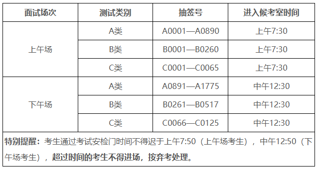 (五)候考安排:候考室设在2号教学楼。上午面试的考生请于7:30前进入候考室,下午面试考生请于12:30前进入候考室。考生进入候考室后不得离开。当天考生人数较多,从校门口到候考室需要一定时间,请考生提前规划时间与路线。