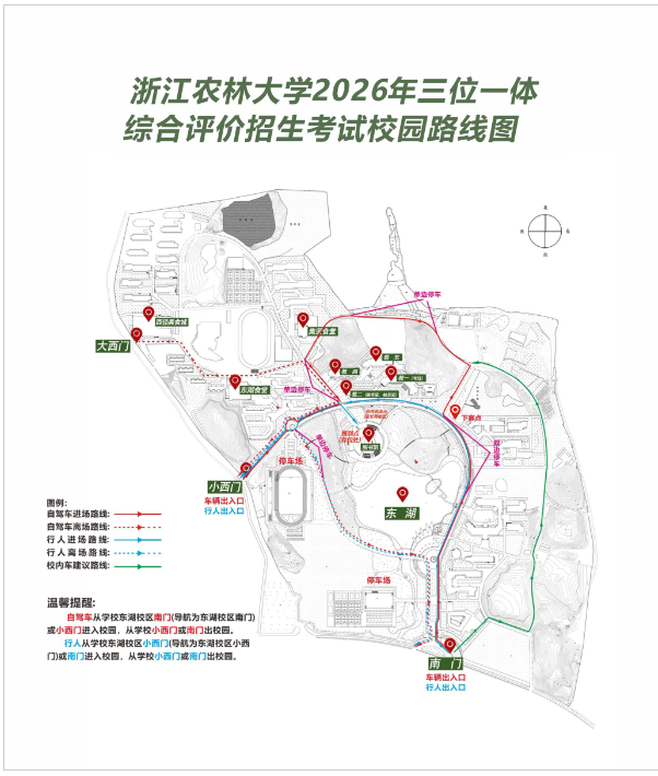 自主选拔在线团队特整理浙江农林大学2026年三位一体综合评价校测公告,包含准考证打印、综合素质测试安排、交通和住宿相关事宜等主要内容,安排详情如下: