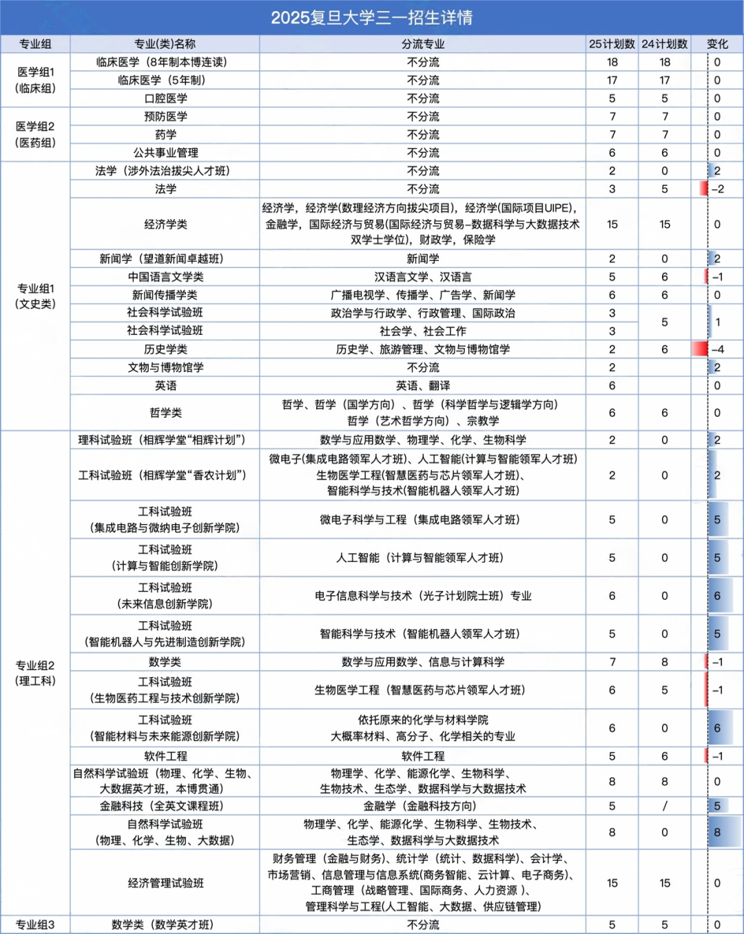 2025年复旦大学三位一体的招生情况发生部分变化,招生专业、部分专业招生人数变化比较大,其他招生政策也出现了部分调整,2025 年具体招生情况如下: