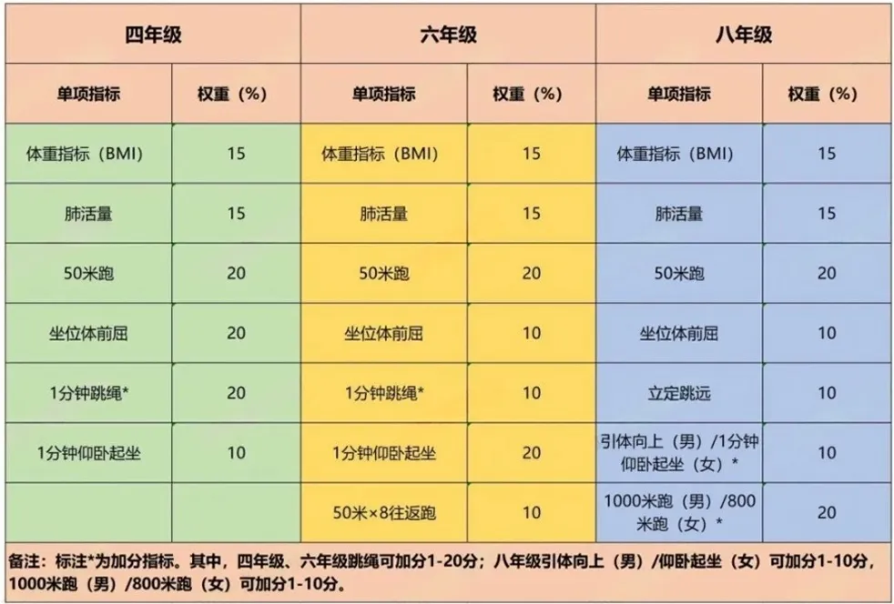 体育过程性考核的内容依据《国家学生体质健康标准(2014年修订)》确定,该标准由教育部确定、全国大中小学统一适用。四、六、八年级的考核指标与权重可以参见以下表格: