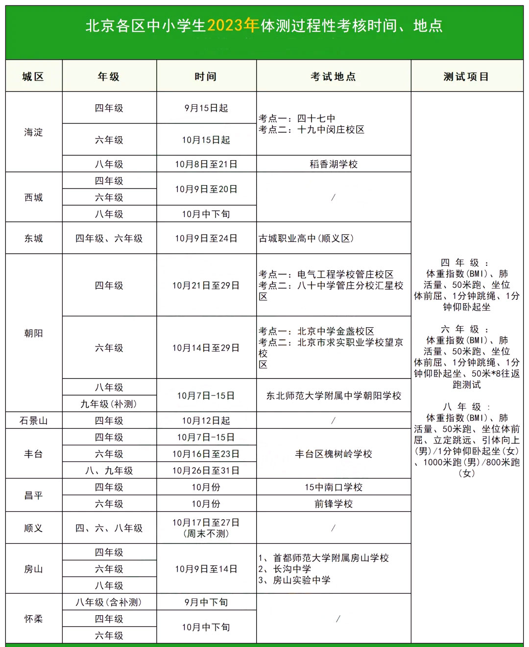 根据往年经验来看,初二体测通常也在9、10月份进行。下面是去年各区体测时间安排,供大家参考↓↓↓