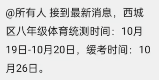 据家长分享:海淀区八一、二十中发布通知体测将在10月中旬开始小学是10月9日-15日开始考;通州区四年级体测从9月19日开始,六年级从10月10日开始。
