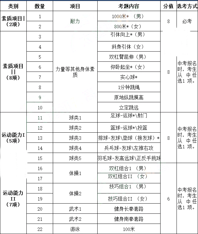 中考现场体育考试设置22项考试内容,比以往增加了14项,每名同学可挑选4项。考试方式是市级统考,由各区负责组织实施,考试的具体时间一般为4-5月。