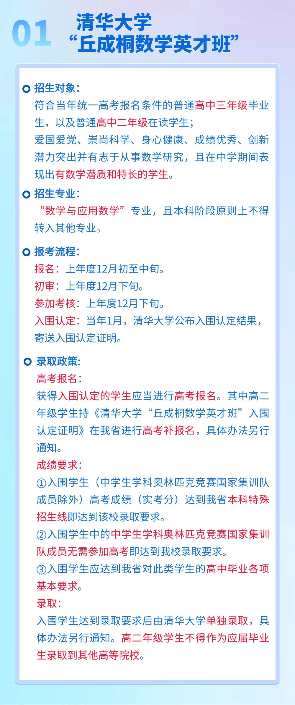 近期,拔尖人才选拔也开始发布公告,想冲击清北的低年级同学可以尤其注意,特别是对于拿了竞赛奖牌的同学,多一种选择就多一种机会。