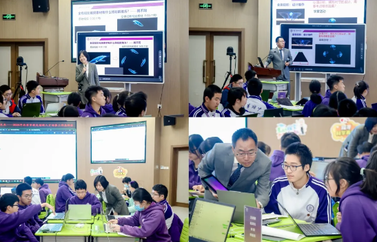 在这堂跨学科STEM课程中,两名教师引导计算机高研实验室的高一学生深入探究机器视觉与全息投影技术的核心原理,并感受科技如何创造视觉奇迹。 在课堂上,学生们积极思考、热烈讨论。他们分析视频素材,探究全息投影的成像原理,并大胆提出自己的猜想。在老师的指导下,学生们分组合作,动手设计成像棱台,并在高研科创云平台上进行编程实践,利用AI技术实现全息投影效果。