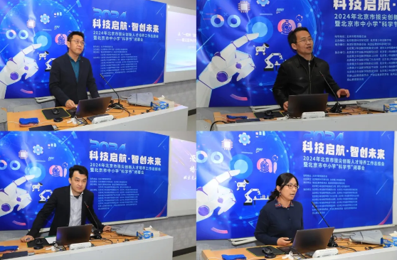 顺义区委教工委委员、顺义区教育研究和教师研修中心主任张军堂(左上)分享《从“一粒种子”到持续“探秘”:顺义区中小学生创新潜质发现的探索尝试》。清华附中副校长、正高级教师、特级教师徐文兵(右上)分享清华附中在科技创新人才培养方面的实践与探索。北京景山学校的张凯老师(左下)分享学校在科学育人方面的实践探索。北京市第三十五中的杜春艳老师和胡静老师(右下)介绍了“气动火箭”探秘项目的开发与实施。