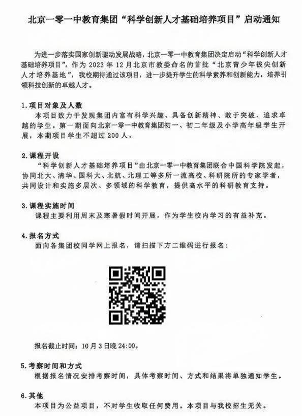 101教育集团科学创新人才基础培养项目9月份报名,10月7日上午测评,目前五六年级接到了通知复试。有家长发现本项目报名通道再次开启。没报名的家长抓紧时间填写!具体情况,请跟随自主选拔在线一起了解一下!