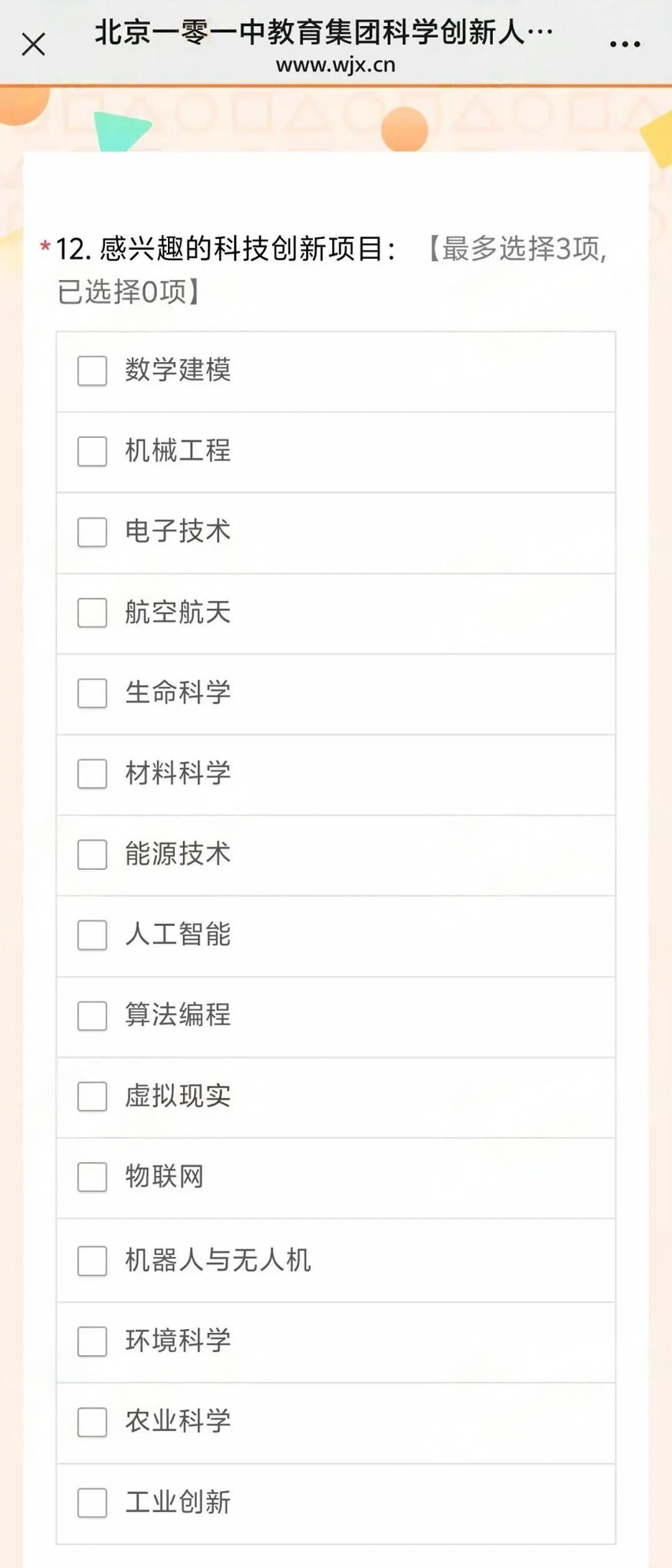 报名表中提到的科创项目有15项,最多可以选择3项。