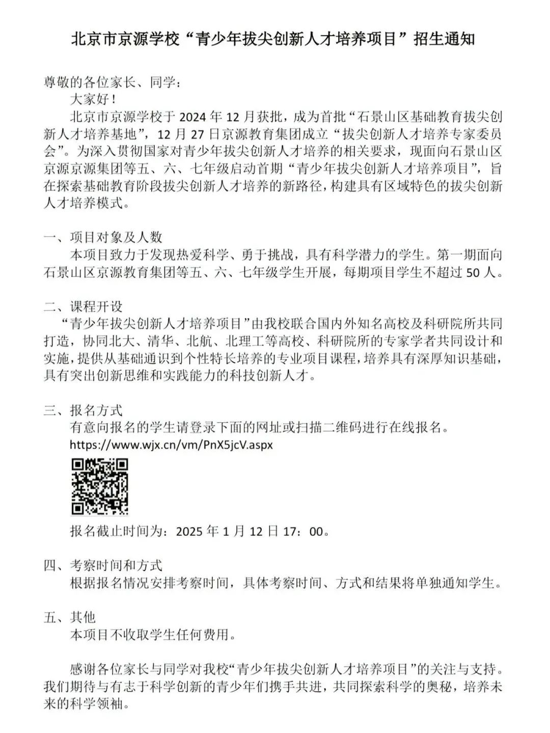 北京市京源学校于2024年12月获批,成为首批“石景山区基础教育拔尖创新人才培养基地”,12月27日京源教育集团成立“拔尖创新人才培养专家委员会”。为深入贯彻国家对青少年拔尖创新人才培养的相关要求,现面向石景山区京源京源集团等五、六、七年级启动首期“青少年拔尖创新人才培养项目”,旨在探索基础教育阶段拔尖创新人才培养的新路径,构建具有区域特色的拔尖创新人才培养模式。