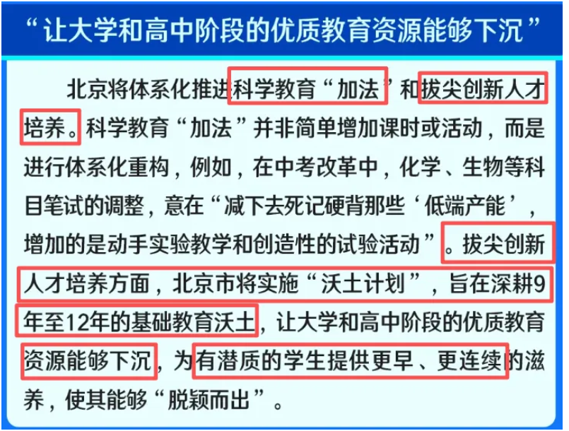 在“十五五”规划中明确提出“推进科学教育‘加法’和拔尖创新人才培养”。北京市将体系化推进相关工作,科学教育“加法”并非简单增加课时或活动,而是进行体系化重构(如中考改革中,化学、生物等科目笔试调整,减少死记硬背的“低端产能”,增加动手实验教学和创造性试验活动);拔尖创新人才培养方面,将实施“沃土计划”,深耕9年至12年基础教育,推动大学和高中阶段优质教育资源下沉,为有潜质的学生提供更早、更连续的滋养,助力其“脱颖而出”。