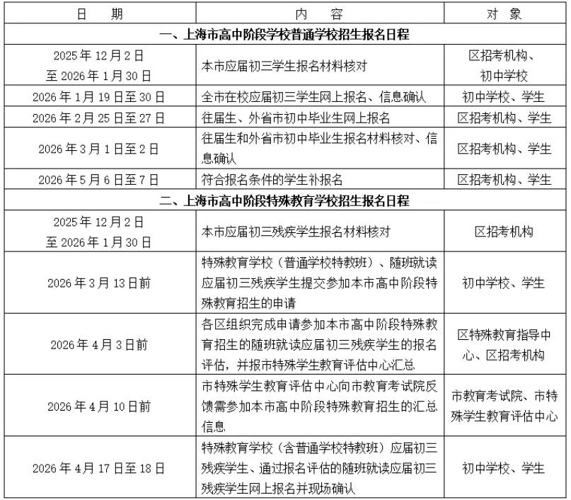 已完成中招报名的本市随班就读应届初三残疾学生,确有意向参加本市高中阶段特殊教育学校招生的,须于2026年3月13日前向所在学校提出申请,由各区组织开展报名评估并于4月3日前将评估结果报市特殊学生教育评估中心汇总,市特殊学生教育评估中心于4月10日前向市教育考试院反馈需参加本市高中阶段特殊教育招生的汇总信息。