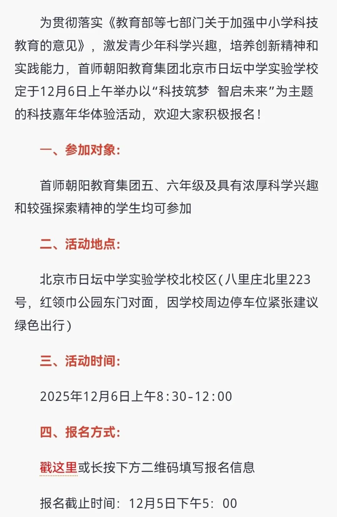 为贯彻落实《教育部等七部门关于加强中小学科技教育的意见》,激发青少年科学兴趣,培养创新精神和实践能力,首师朝阳教育集团北京市日坛中学实验学校定于12月6日上午举办以 “科技筑梦 智启未来” 为主题的科技嘉年华体验活动,欢迎大家积极报名!跟随自主选拔在线团队一起来看!