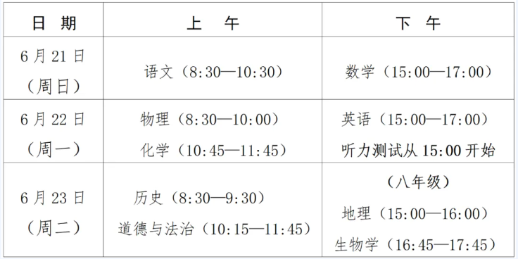 经研究,2026年中考省级统一考试安排在6月21日—23日举行,具体科目考试时间安排如下: