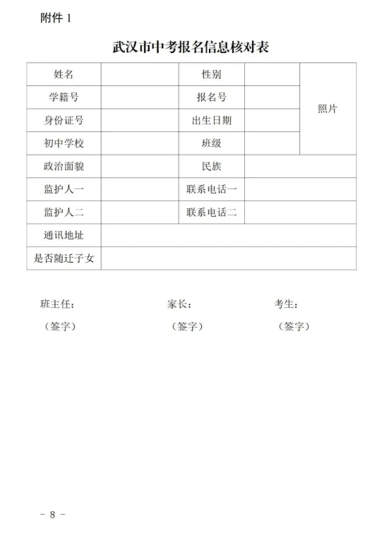 (4)组织核对信息(1月24日—1月30日):初中学校组织考生在“中招平台”完成,打印《武汉市中考报名信息核对表》(附件1),考生及家长签字确认,学校留存备查。