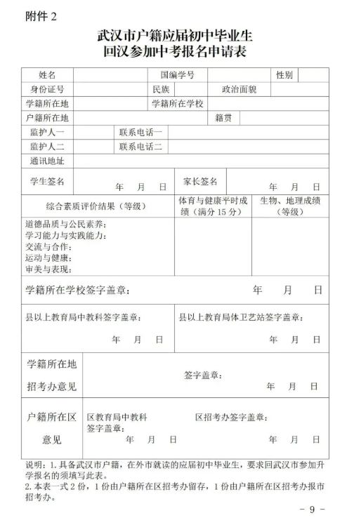2.武汉市户籍应届初中毕业生回汉参加中考报名申请表
