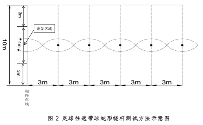 特别说明:必须在往返带球中绕过每一根杆,如未绕过杆或在测试过程中碰倒标志杆,则加罚时间(每漏绕/碰倒一根杆加罚3秒,漏绕/碰倒n根杆加罚n×3 秒时间)。