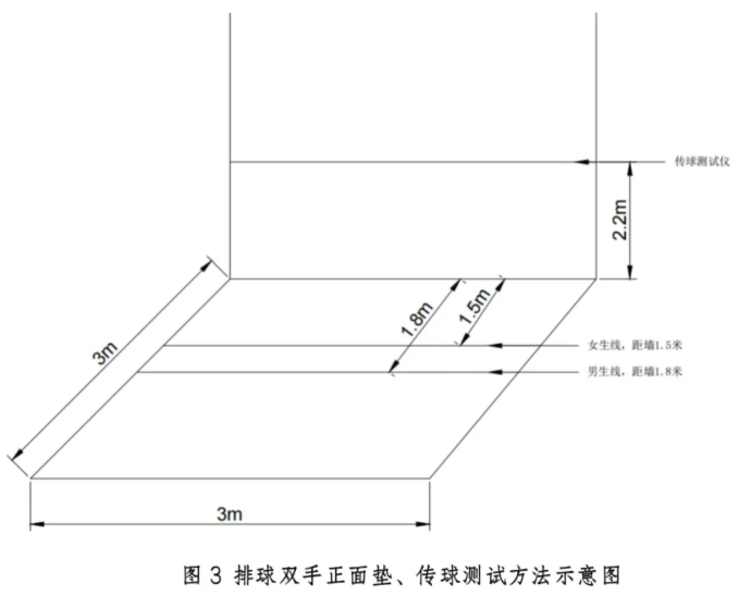 考试场地:场地设置在地面平坦、坚实的场所,在3×3 平方米平整地面摆放排球垫球测试仪、排球传球测试仪。排球传球测试仪固定在与地面垂直的墙上,高约2.2米处,男生在地面距墙1.8米处、女生在地面距墙1.5米处划线。如有两个排球测试场地同时开始考试时,两个排球测试场地之间的距离至少间隔5米。