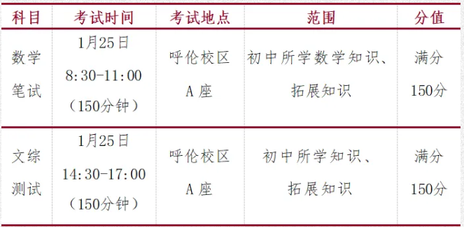 招生对象为具有呼和浩特市四区普通高中升学资格学生,呼市二中如意校区、呼伦校区和金川校区三个校区招收数学、信息学、历史类总人数不超过150人,其中,信息学类不超4人,历史类不超20人。符合初审报名条件的同学,经过初试选拔,按照招生比例1:2进入复试,之后结合初试和复试成绩最终录取。录取后,将在呼市二中呼伦校区单设英才班进行集中培养。