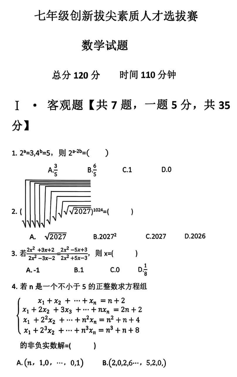 本次试题聚焦数学思维与创新能力考查,题型灵活、层次清晰,旨在选拔具备突出数学潜质的优秀学子。以下是试题完整内容,供学校、教师及学生参考使用。