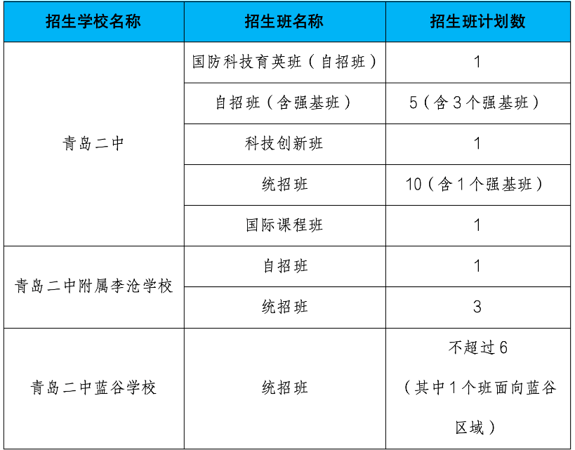 6.青岛二中蓝谷学校,招收不超过6个班(其中1个班面向蓝谷区域)。