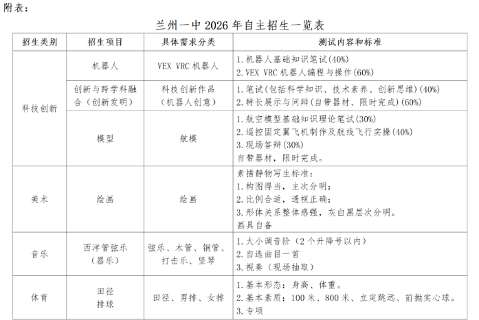 4.测试内容和标准:见附表《兰州一中2026年自主招生一览表》
