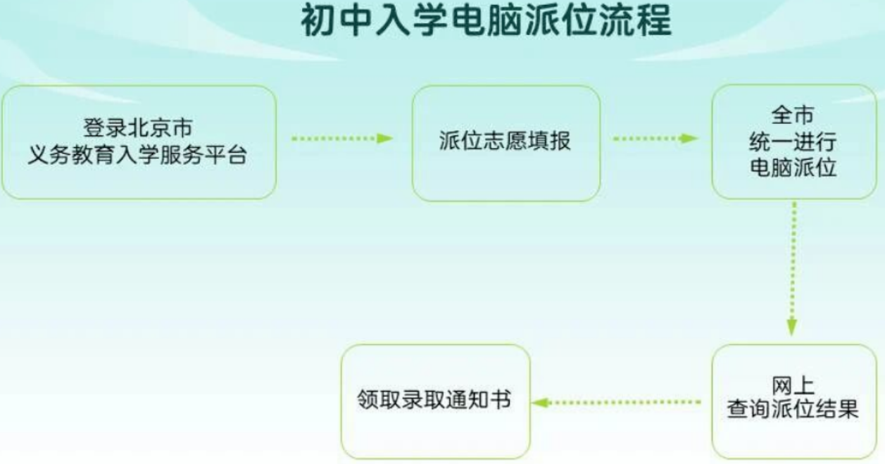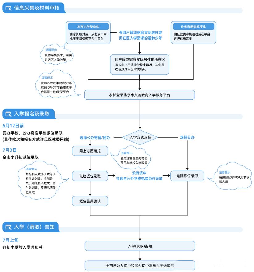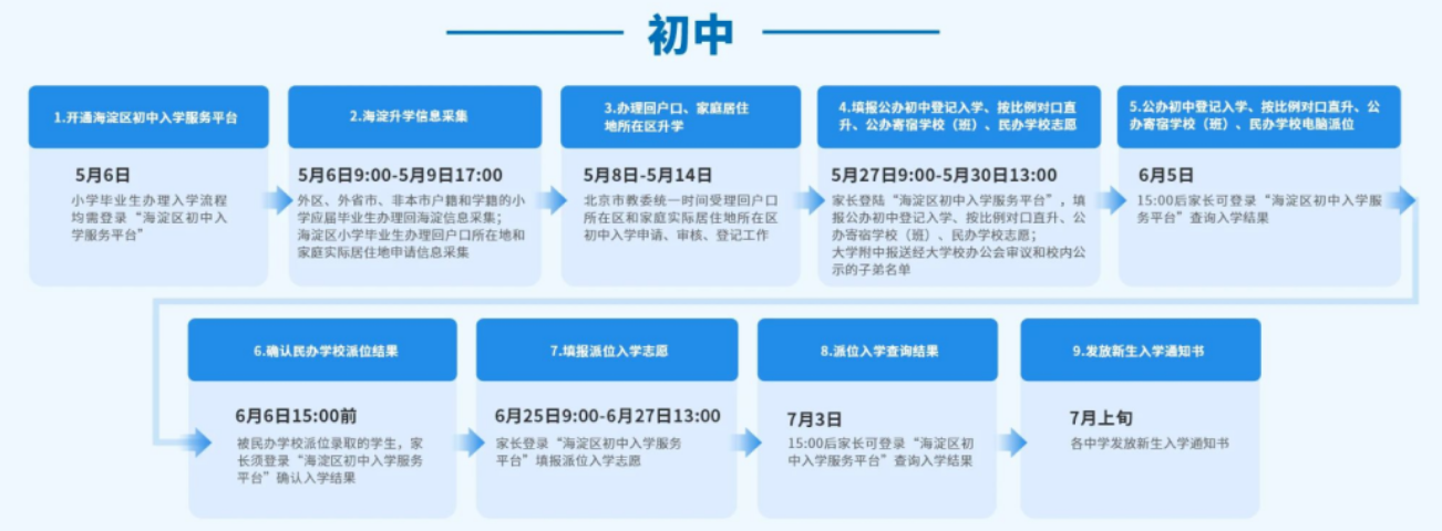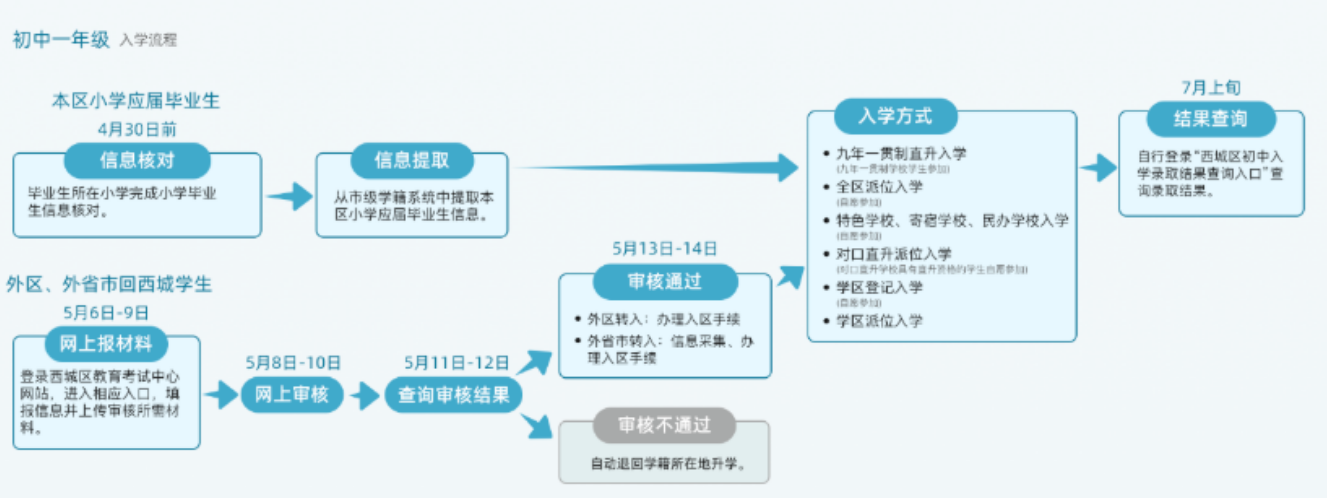 | 7月上旬 | 各小学和初中发放新生入学通知书在京小升初 |