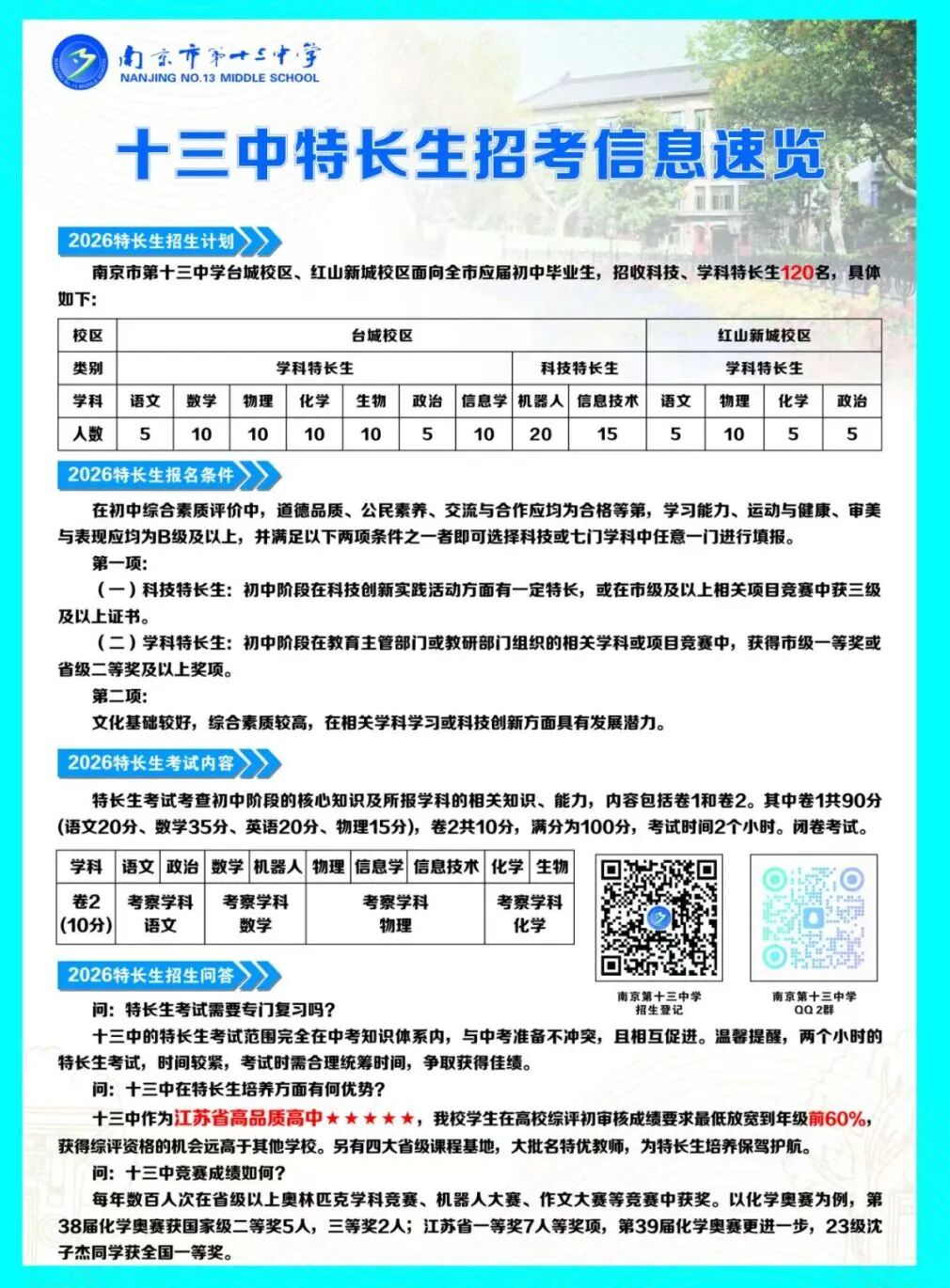 南京十三中2026年特长生招生工作正式启动。本次招生计划共计120人,涵盖多个专业学科,旨在发掘和培养具有特殊才能的优秀学生。以下是具体招生简章内容,大家一起来看!