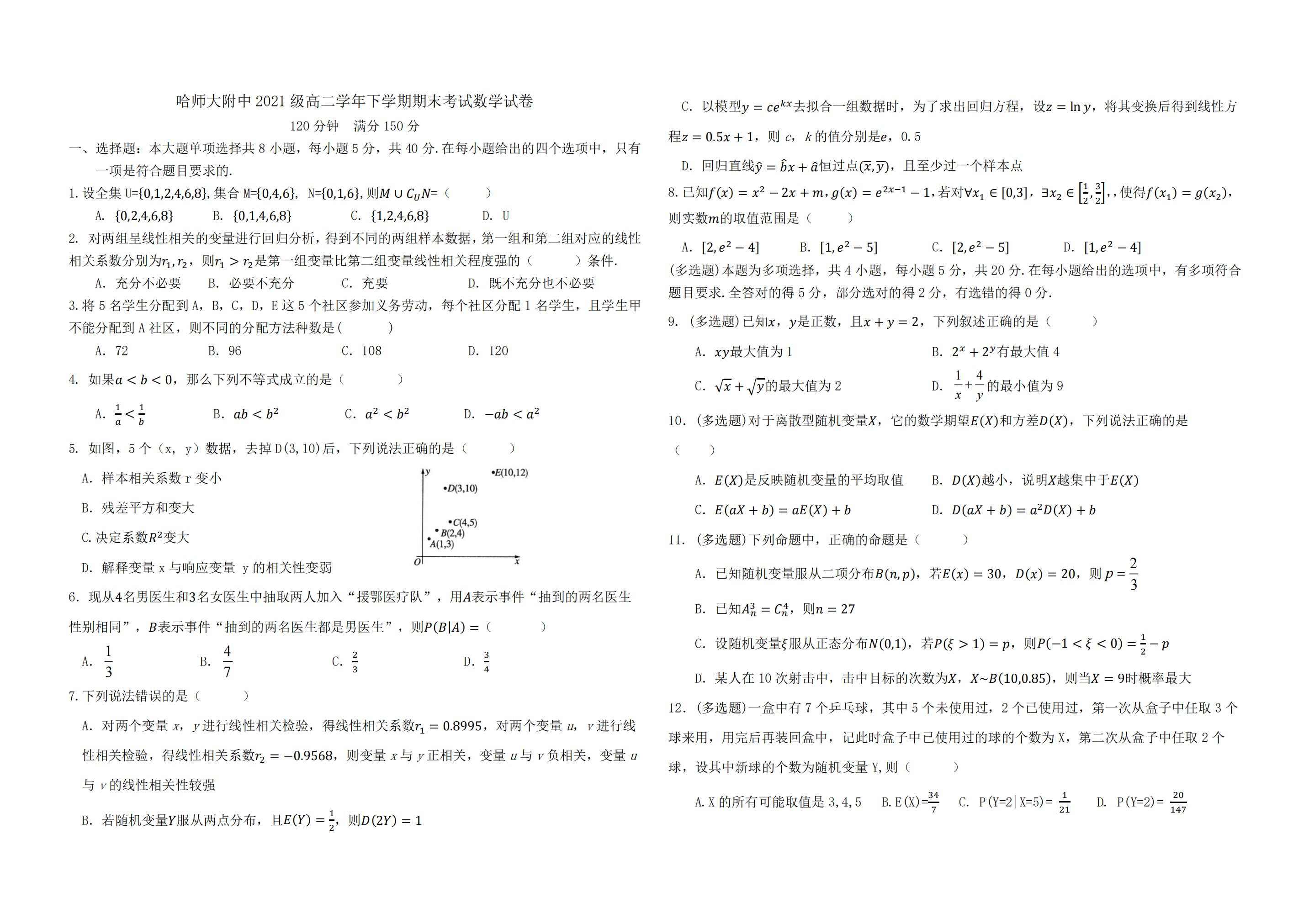 黑龙江省哈尔滨师范大学附属中学2023高二下学期期末考试数学试题