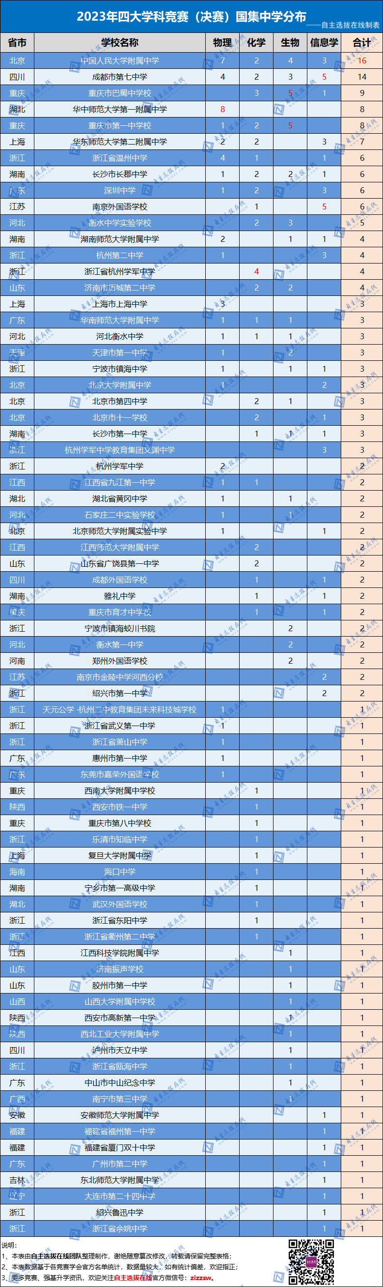 2023年化学决赛11月8日在北京落下帷幕,至此,2023年五大学科竞赛已完成物理、化学、生物和信息学4个学科,自主选拔在线整理了2023年四大学科竞赛决赛国家集训队中学分布,人大附中以16人位居首位。