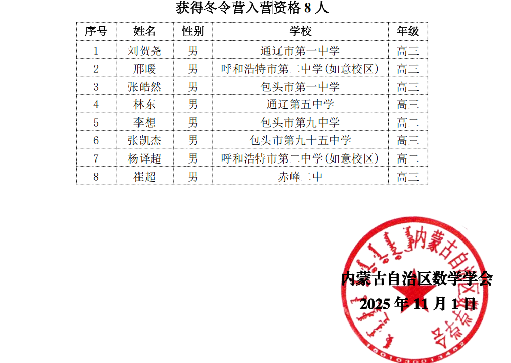 内蒙古2025年第41届全国高中数学竞赛联赛省队获奖名单