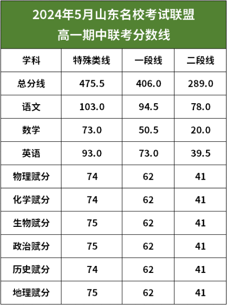 2024年山东名校联盟高一年级期中考试分数线已公布!特招线475.5分,一段线406分!齐鲁家长圈为大家整理2024年5月山东名校联盟高一期中划线,一起来看看吧~